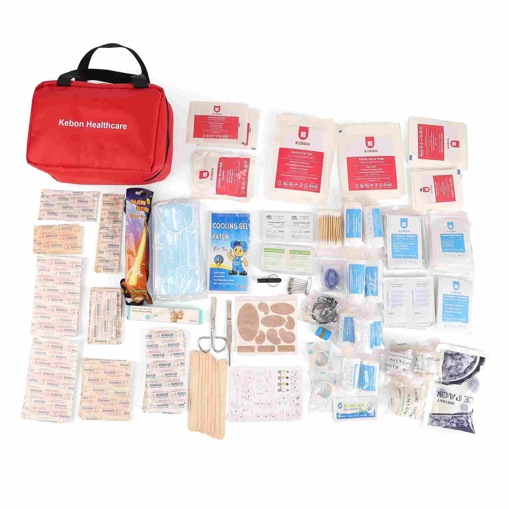 カテゴリー含まれるアイテム滅菌包帯ガーゼパッド、滅菌創傷包帯、吸収性パッド包帯とラップ弾性包帯、三角包帯、粘着テープ創傷ケア混合絆創膏、アルコールパッド、クリーニングワイプ緊急ツールはさみ、ピンセット、安全ピン、使い捨て手袋その他の必需品インスタントアイスパック、医療用テープ、創傷絆創膏シート
